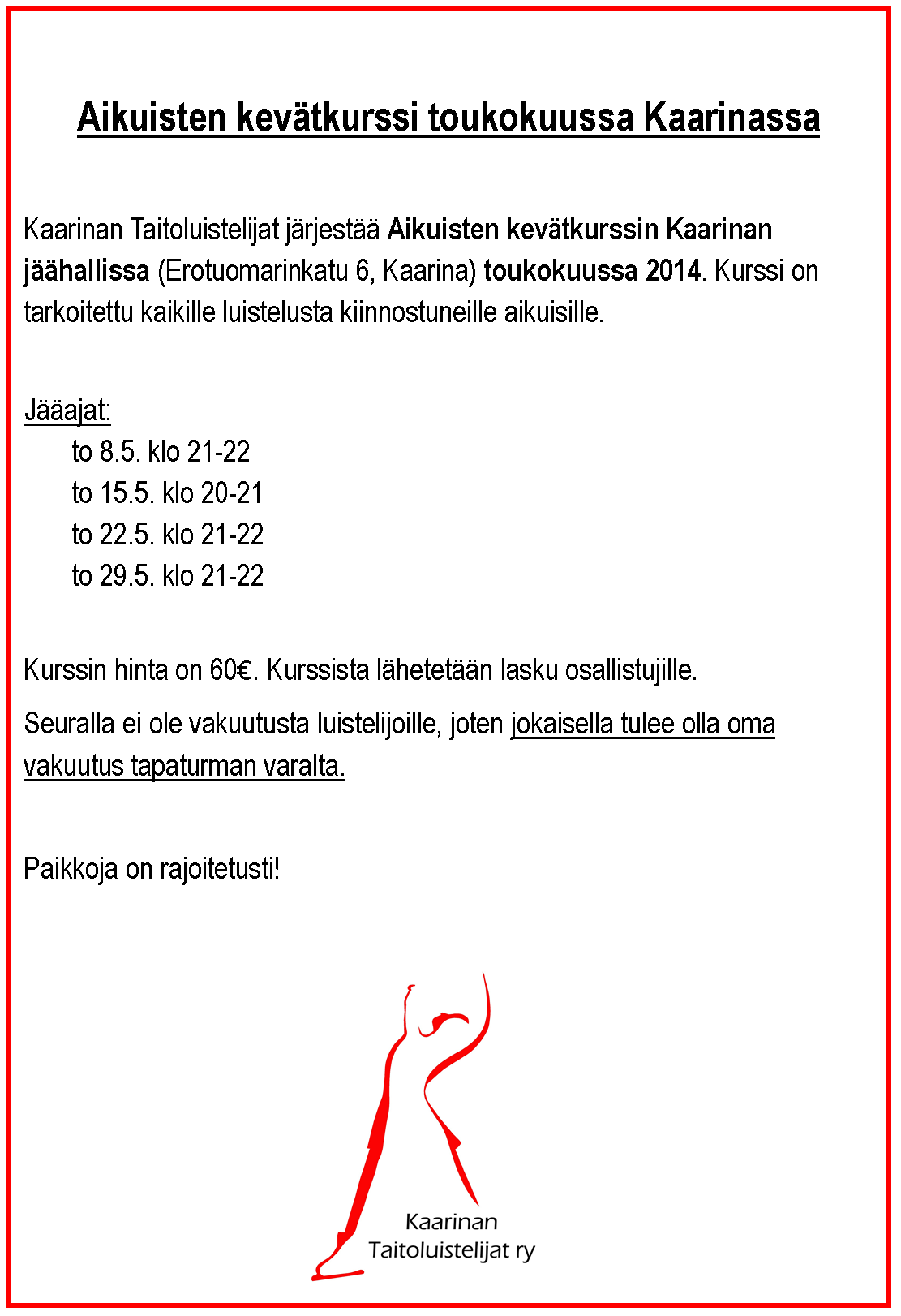 Kaarinan Taitoluistelijat järjesti tiistaina ohjelmatapahtuman Kaarinan jäähallissa. Illan aikana nuoret luistelijat esittivät tuomareille kauden aikana oppimiaan taitoja. Toinen toistaan upeampia esityksiä oli katsomossa todistamassa runsaslukuinen yleisö.